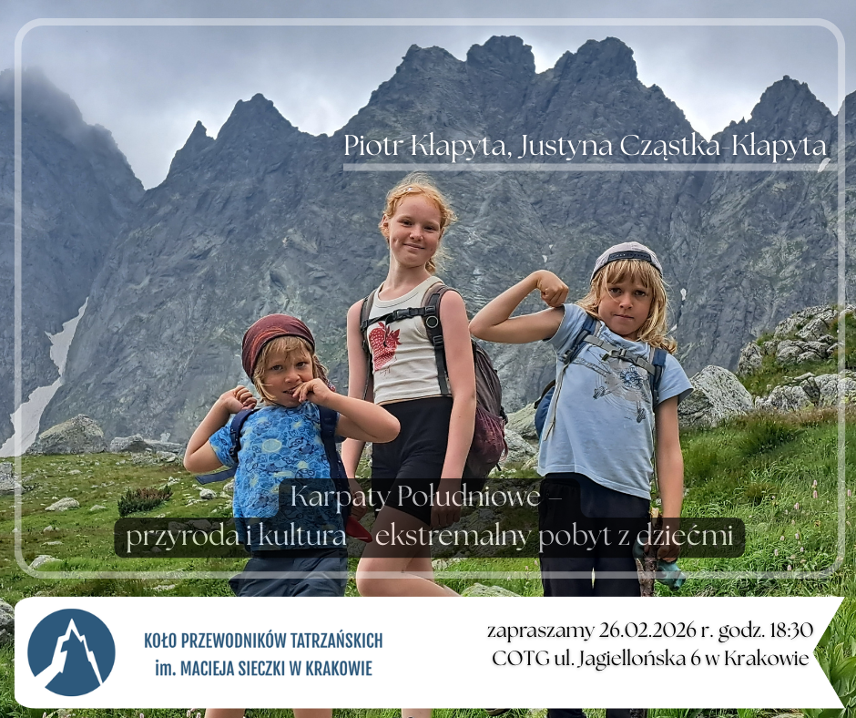 W imieniu Organizatorów serdecznie zapraszamy na spotkanie z Justyną i Piotrem Kłapytami – oraz Ich dziećmi – zatytułowane Karpaty Południowe – przyroda i kultura – ekstremalny pobyt z dziećmi, które odbędzie się w czwartek, 26 lutego 2026 r. o godz. 18:30 w Centralnym Ośrodku Turystyki Górskiej PTTK w Krakowie, ul. Jagiellońska 6.