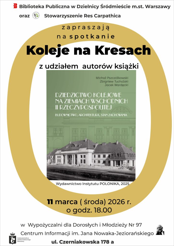 Zapraszamy serdecznie 11 marca 2026 r. (środa) na godz. 18:00 do Centrum Informacji im. Jana Nowaka-Jeziorańskiego, ul. Czerniakowska 178a w Warszawie (Solec), na kolejne interesujące spotkanie poświęcone kolejom na Kresach z autorami książki „Kolejowe dziedzictwo na ziemiach wschodnich II Rzeczypospolitej. Budownictwo, architektura, stan zachowania” wydanej w 2025 r. i anonsowanej już na naszych stronach WWW [js].